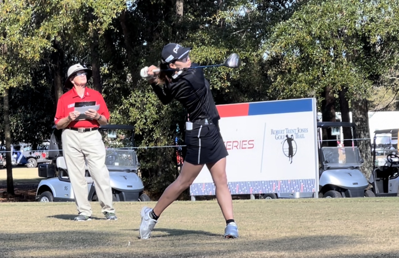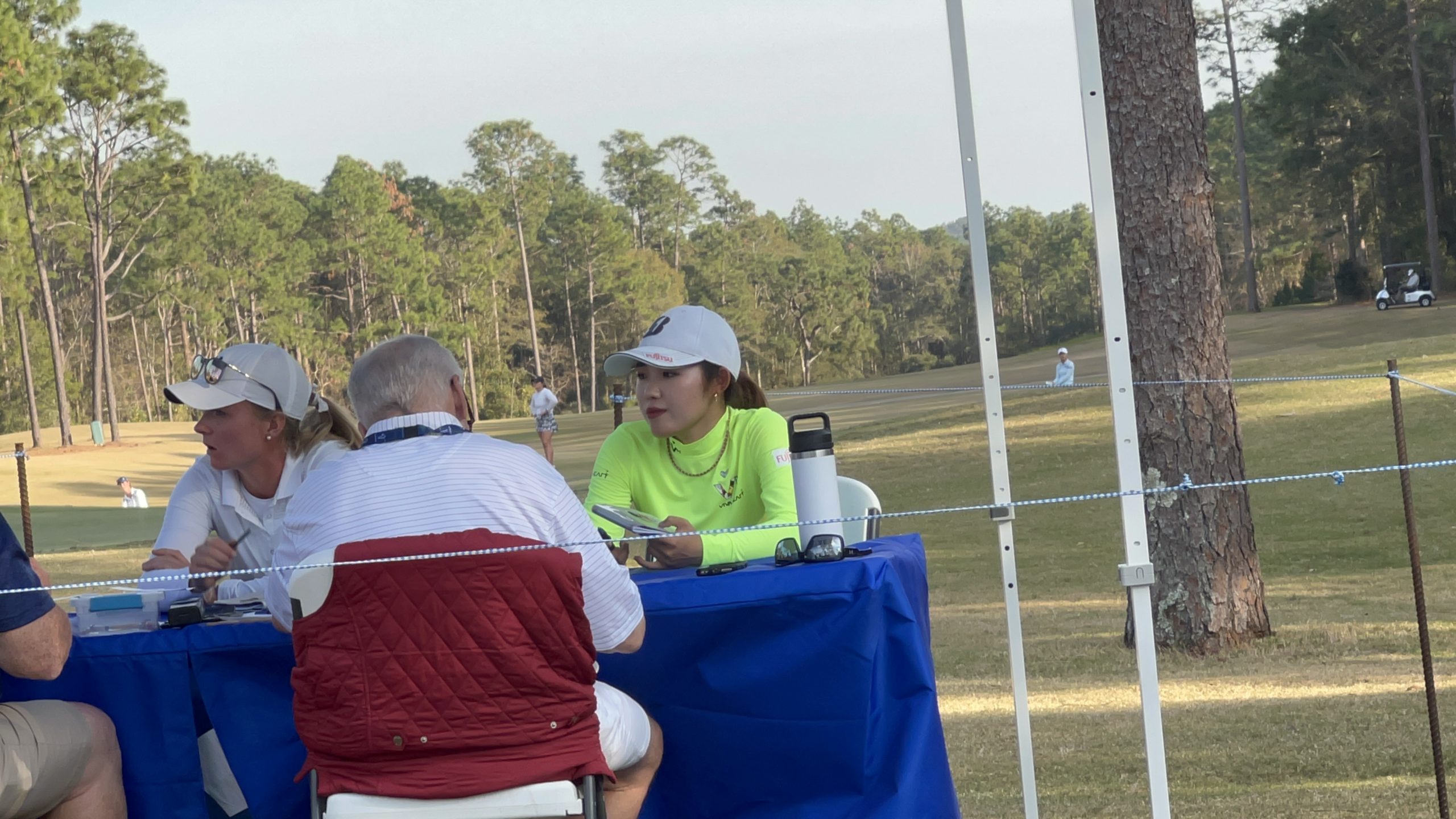 Qシリーズのオペレーションってシンプルっちゃシンプル。基本的に1組3人にボランティアが一人しか付きません。担当の選手達を追って乗用カートを運転しながら選手のスコアを記録しているようです。たまにティーグランドやグリーン担当のボランティアもいましたけどすべてのホールに常駐しているわけではないようです。またトーナメントでは当たり前のキャリングボードを持つスタッフもいません。というかリーダーボードなるものすらこのコースには見当たりません。ギャラリースタンドなどもってのほか。特設されているのは1番ティーグラウンドのチェックイン&スターター用テントと18番グリーン奥のスコア確認用テントの二つのみです。フードコートもなければ仮設トイレもありません。選手用のトイレをギャラリー/ボランティア/関係者も使います。