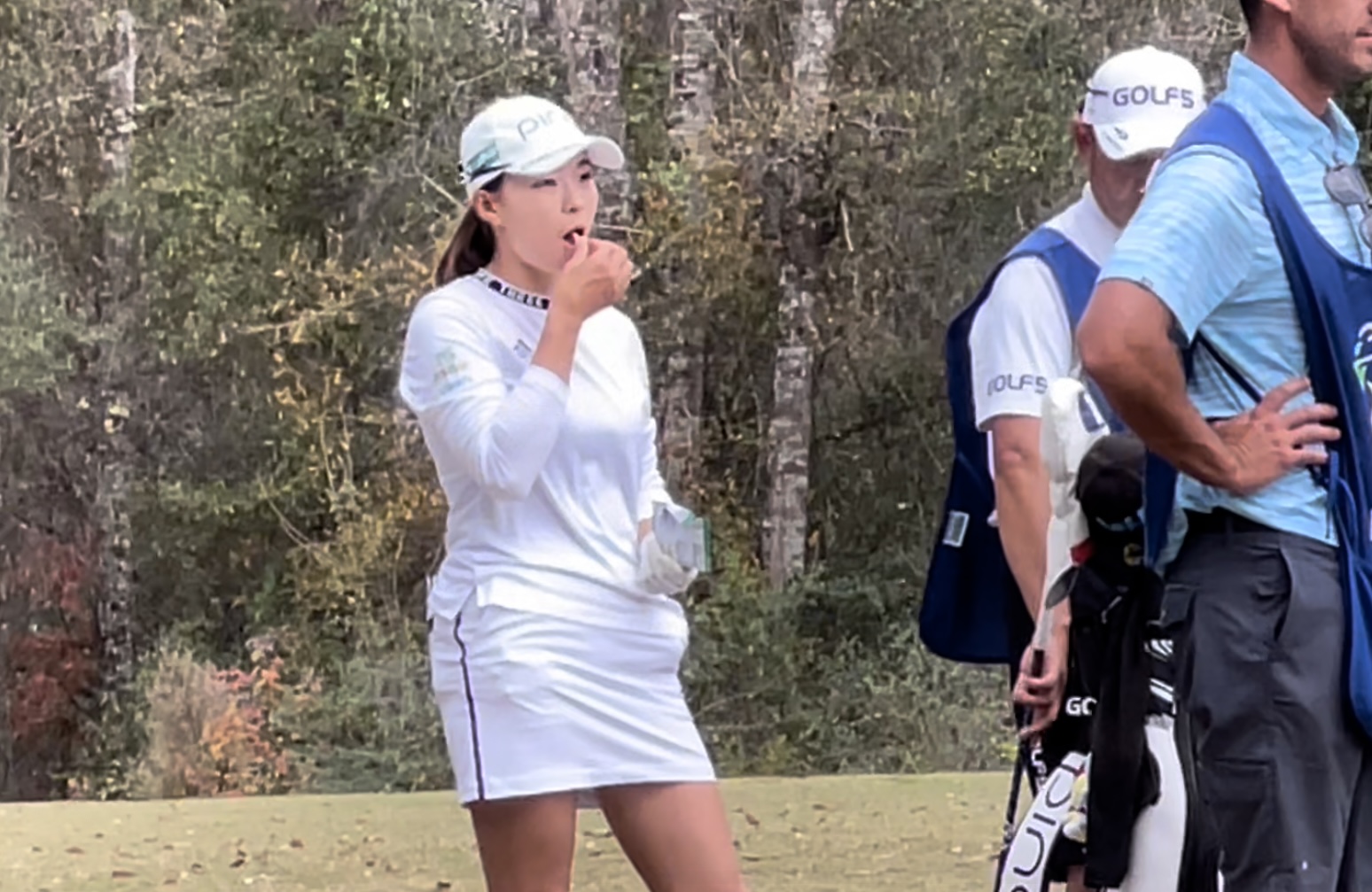ギャラリー数は昨日と一緒かな。w 古江さんと同じ組で、翌週最終日まで単独首位を快走していたポーリーヌ・ルサン・ブシャール選手の身内の方々かなにかがこの組についておられました。フランス語で話されていたのが面白かったですね。もうひとりの同伴競技者、エミリー・ペダーセン(ペデルセン)選手はデンマーク出身ですから、みなさんキャディと母国語で話されていました。英語で話していたのは古江さんとそのキャディだけ。w この国際色豊かで、かつバイリンガルは当たり前なLPGAの特徴をよく表しているグループでした。