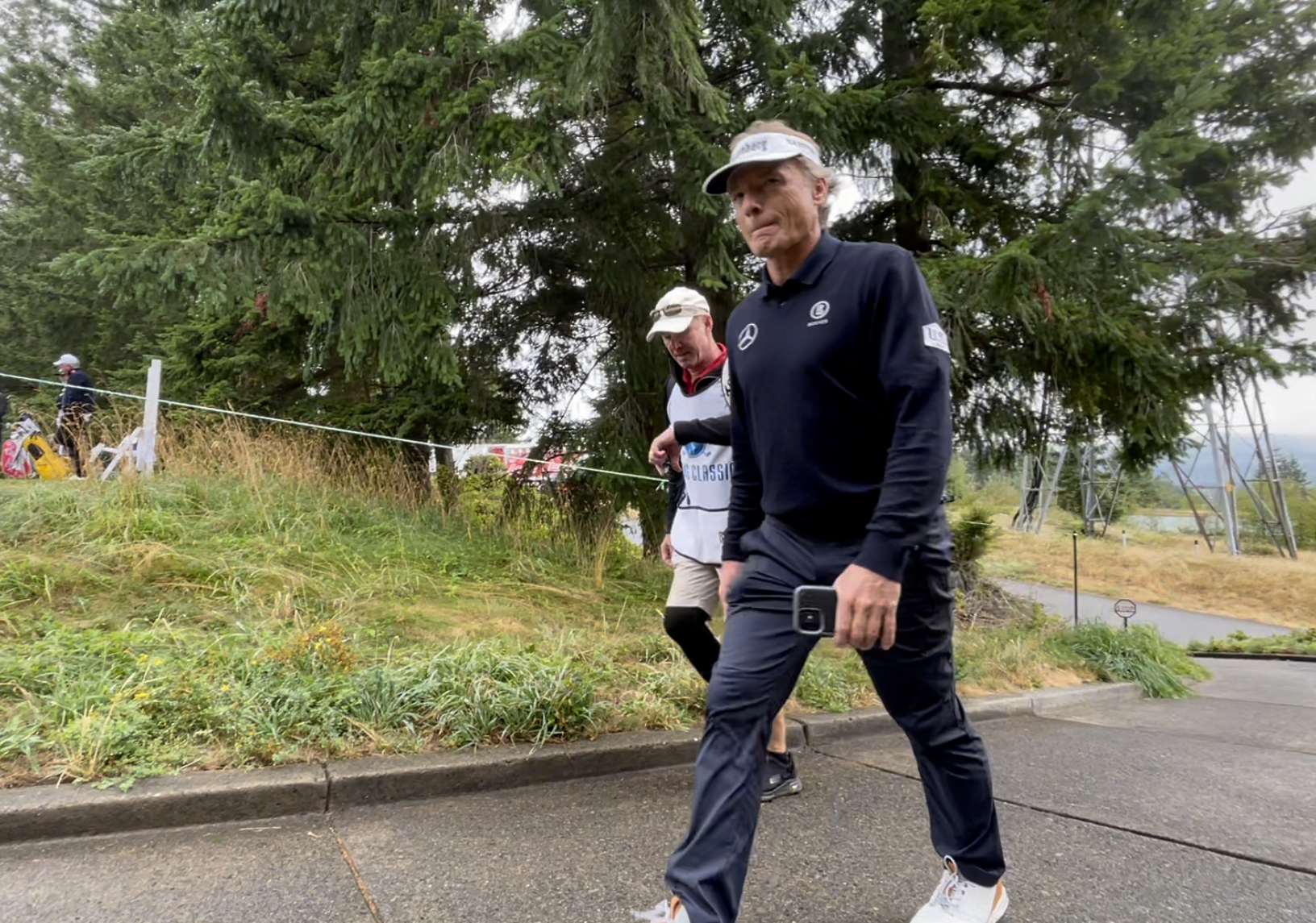 ベルンハルト・ランガー(63)の組から追うぜ!と意気込んでいたら、暫くしてコース上にいた選手・関係者がどんどんクラブハウスに引き上げていきます。どうやら濃霧のためプレーが一時中断になったようです。