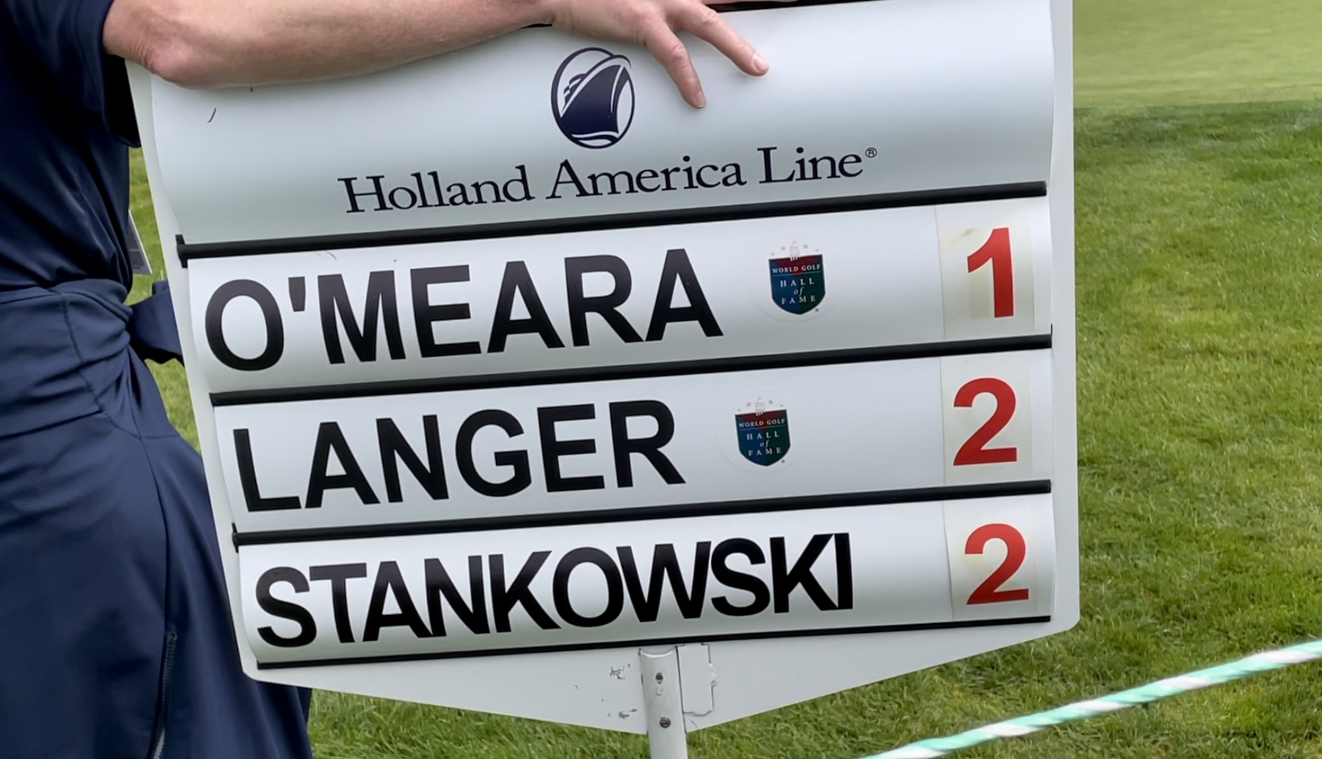 スコアボードのプレイヤー名右側に貼ってあるシールは「ゴルフ世界殿堂入りメンバー」の証し。PGAメジャーを複数回制しているオメーラもランガーももちろん殿堂入りしています。ティーオフの際、スターターに「世界ゴルフ殿堂の・・」という枕詞を付けてもらう名誉が漏れなくついてきます。同じく世界殿堂入りしている尾崎将司や青木功がシニアトーナメントに出場すれば同じ待遇を受けるでしょう。(残念ながら出場権がありませんが。)