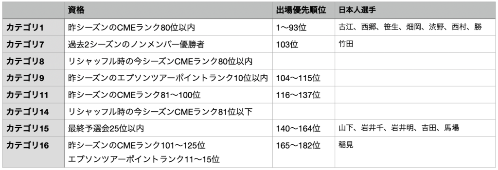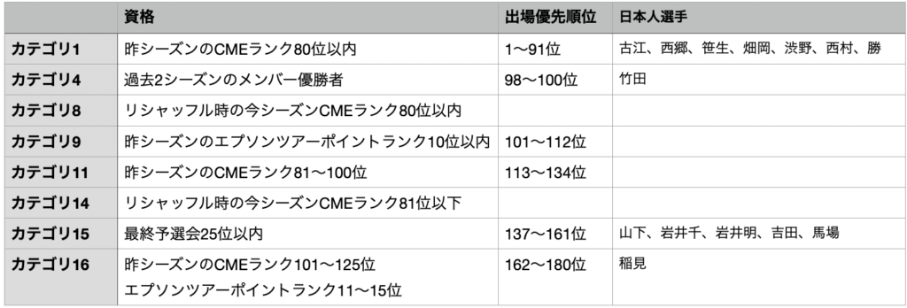 前年のCMEランク上位者というカテゴリもあるにはあるんですが、80位のシェブロン除けば、30位や35位までとかで、本当にトップのトップだった選手しか該当しません。