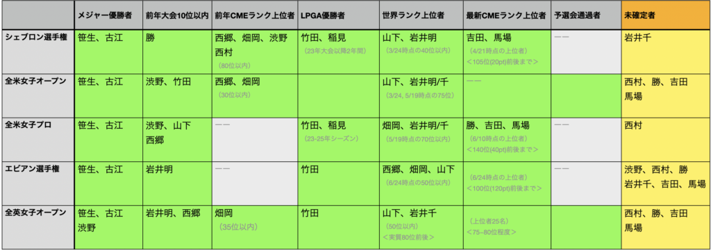 岩井明愛選手と渋野選手が、前年トップ10入りしたメジャー大会が複数あり、出場権を確実にしています。