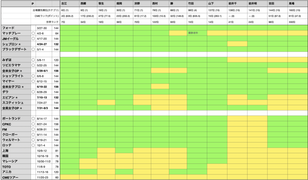 例えば上から2番目のマッチプレー。今季優勝者枠で出場が可能な竹田麗央選手は、すでに大会の欠場を決めています。ですが出場権は降りてきたということで、緑のセルで塗りつぶしています。